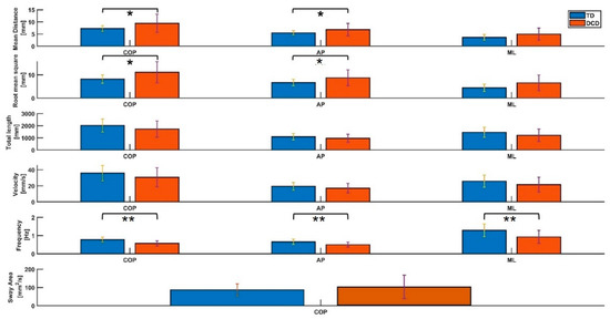 The evaluation conducted with the MABC-2 shows that all the children in the DCD group have motor performance <16 percentile, while the TD children >16 percentile. None of the 48 children recruited were excluded from the study. Figure 1 shows the comparison between the VRRS mean parameters collected from the TD and DCD groups. As can be seen, the mean values and the standard deviation of the DCD group are slightly higher than those of their TD peers. However, there is a significant difference between the parameters related to the mean distance, the RMS, and the frequency of the COP (i.e., MDCOP, RMSCOP, FREQCOP) (p < 0.05). In addition, the AP component of the same parameters (i.e., MDAP, RMSAP, FREQAP) also offers results which are statistically significant (p < 0.01), whereas a statistical difference is not found for the respective ML components, except for the FREQML (Table 2).