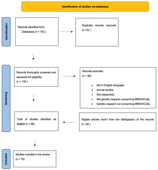 A total of 162 articles were identified from all databases using the search strategy, of which 32 were duplicates. In total, 30 eligible studies were identified from the hand search of the citations of the articles. According to both our inclusion and exclusion criteria, in total, 76 studies were considered eligible and included in this SR. Table A1 presents all 76 studies, sorted by year of publication, along with the main results and the number of individuals with MRKH syndrome or CUAs and controls who were studied.