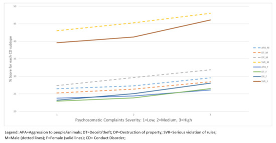 The main implications of this study are that if left undetected, psychosomatic complaints in younger children, especially boys, may later develop into serious rule violations and other conduct problems. This suggests serious consequences for socio-economic engagement, especially during school, continuing education, and employment prospects, where adhering to rules is essential for progress. As such, the present study aimed to better understand what might limit the performance of school-attending adolescents who may develop behavioural and mental ill-health later on. We considered the relationship between self-reported PSC and behavioral problems, to determine whether PSCs are a valuable gauge for early interventions to prevent the development of serious mental disorders into adulthood. If it is possible to link PSCs to potential future conduct problems, these can be used for earlier detection and intervention, to enhance the future well-being of children. The findings we present suggest that high levels of PSCs may be associated with higher levels of behavioural problems, and each of the four conduct problems subtypes linked to DSM-5 CD criteria, but most specifically for serious rule violation. This association is amplified for older boys. Neural dysfunction models of executive dysfunction may provide clues as to how early life PSCs may influence the brain development associated with decision-making, emotional regulation, and empathy. Children aged 15–17 (the age of the present cohort) undergo major developmental changes in the body and brain, and so the early detection of PSCs may have a huge impact on their later brain function and behaviour. An inability to effectively utilise somatic cues which are the basis of empathy and decision-making (e.g., due to a higher incidence of PSCs that may obscure the ability to attend effectively to somatic cues) may increase the prevalence of low prosocial emotion, rule violation, anxiety, and depression. Furthermore, when combining the findings from the present study with previous research, it is possible that PSCs contribute to mental health difficulties in both genders, but that coping mechanisms or presentation of symptoms differ between boys and girls. These data suggest that the early screening of children and adolescents at school for psychosomatic complaints may help to identify a need for intervention that could prevent the future development of behavioural problems and adult psychiatric conditions.