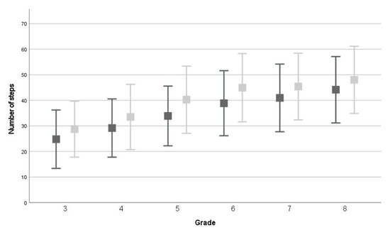 For all test items, an interaction-effect between time and grade was found (WB: F(5,2558) = 6.011; p < 0.001; partial η2 = 0.012, MS: F(5,2558) = 7.189; p < 0.001; partial η2 = 0.014, JS: F(5,2558) = 2.496; p = 0.029; partial η2 = 0.005, EHC: F(3,1766) = 11.231; p < 0.001; partial η2 = 0.019). For WB, children in grades 5–6 developed, on average, more than children in grades 3 and 8, and children in grade 5 also developed more than children in grade 4 (see Table S1). For MS, children in grade 3 showed significantly less development than children in other grades (see Table S2). For JS, children in grade 6 showed significantly more development than children in grades 3, 4, and 8 (4 ± 10, p < 0.001, see Table S3). Finally, for EHC, children in grade 5 (11 ± 11) showed significantly more development than children in the other grades (see Table S4). All other comparisons between grades for the four test items were not significant.