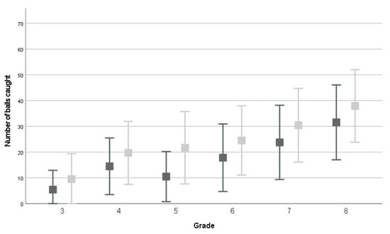 The EHC-test item was conducted differently for children in grades 3 and 4 (allowed to catch the ball with two hands) compared to children in grade 5–8 (they had to catch the ball with one hand) [10]. Due to this difference in the protocol, results of the EHC-test cannot be compared between grades. Therefore, only results of the EHC-test item of children in grades 5–8 were used for analysis.