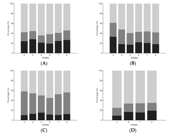 Percentages of children with positive (light grey), no (dark grey), or negative (black) development per grade. Results per panel: (A) walking backwards, (B) jumping sideways, (C) moving sideways, (D) eye hand coordination.