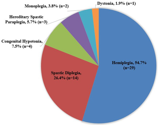 There were 53 children with CP (36 males and 17 females) and 58 TD children (34 males and 24 females). Physical characteristics, grades in school, and race/ethnicity are presented in Table 1. The fifty-three children with CP consisted of level I [N = 26 (49.1%)] and level II [N = 26 (49.1%)] of the GMFCS level, and there was one child with CP who did not wish to share this information [N = 1, (0.8%)]. Furthermore, clinical diagnoses of the children with CP were expressed in Figure 1.