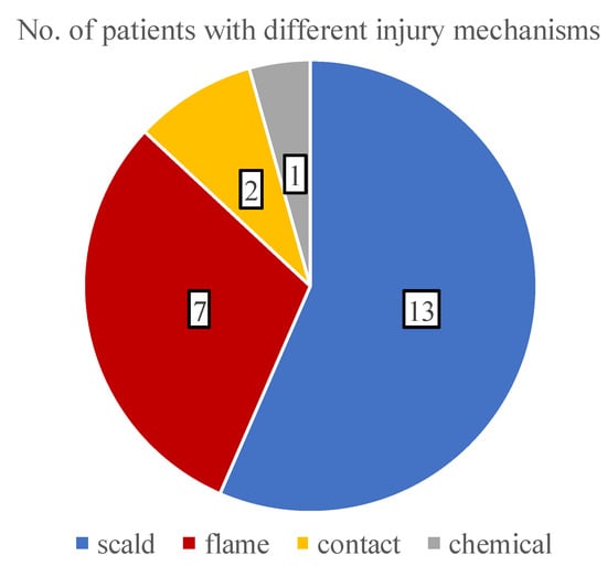 With the analysis of the burn etiologies, we found that all of the traumas were accidental and the most common mechanism was scalding (56.5%), followed by flame (30.4%), contact (8.7%), and chemical injuries (4.3%) (Figure 3). During infancy, the incidence of scalding was 85.7% (6 out of 7 patients), while in teenagers, the risk of flame-caused burns increased to 66.6%.