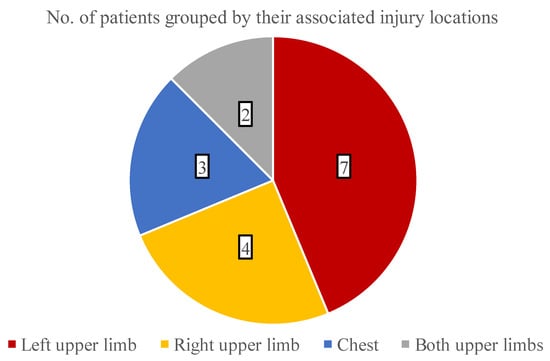 The analysis of additional thermal injuries besides facial burns was also conducted, which is presented in Figure 5. Overall, 11 children suffered burns in multiple areas and most commonly (30.4% of all cases) the left upper limb was damaged.