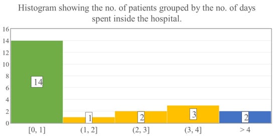 The evaluation of LOS revealed that 11 children could be treated ambulatory, thus the mean overall hospitalization was notably low, on average 2.0 days (SD: 3.8; range: 0–14 days) (Figure 7). When only the inpatient’s LOS was estimated, it showed that children who were admitted to our ward required 3.8 days (SD: 3.2; range: 1–14 days) until they could be discharged.