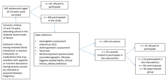 Previous studies have reported high prevalence rates of anemia in Yemen, reaching 40% among pregnant women and 49% among children [28,29]. However, to our knowledge, there are no studies that have examined the prevalence of anemia among adolescents in Yemen, or the factors that may be associated with anemia in this vulnerable population. It is in this context that this study was undertaken, with the aim of (1) assessing the prevalence of anemia among adolescents living in the war-affected region of Hodeida in Yemen; (2) investigating sociodemographic, clinical, and lifestyle-related factors that are associated with anemia in this population. A secondary objective of the study was to examine the effectiveness of a nutrition education intervention in improving hemoglobin levels and anemia-related nutrition knowledge among anemic adolescents in Hodeida. Data stemming from this study could help in the development of context-appropriate strategies and programs to address anemia, and its correlates, in Yemen.