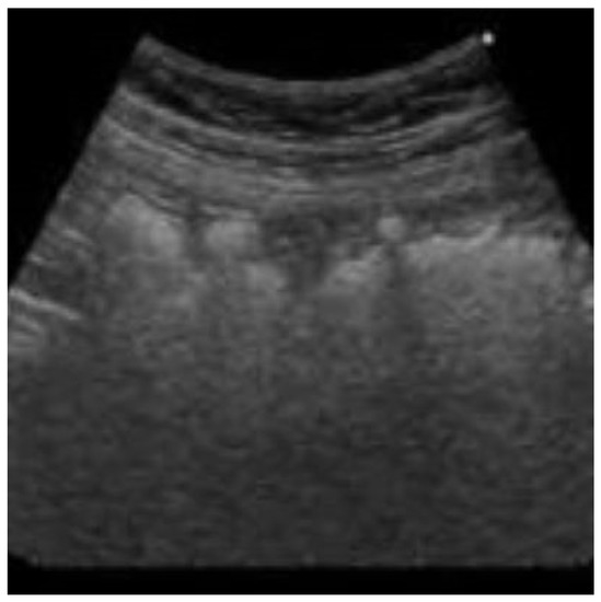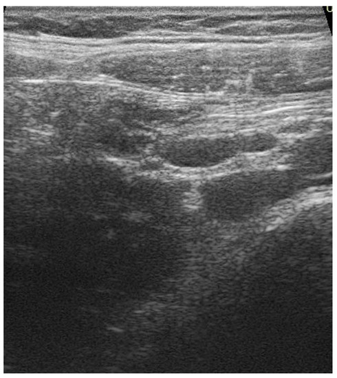 On admission, the patient performed blood examinations that showed an increase in systemic inflammation index (C reactive protein—CPR 5.21 mg/dL, cutoff of normality < 0.5 mg/dL) and a slight increase in white blood cells (10.45 × 103/µL) with an increase in the neutrophil quota (neutrophils 84.5%—8.83 × 103/µL, lymphocytes 10%—0.54 × 103/µL, monocytes 10.1%—1.06 × 103/µL). The examination of blood biochemistry and the study of coagulation indices was within the normal range. Additionally, the patient performed the following instrumental examinations: a CT encephalic scan for the persistent headache that was non-responsive to medication, which was negative, a color-Doppler echocardiography, with normal results, and an abdominal ultrasound, which revealed the presence of enlarged lymph nodes and mesenteric inflammation (Figure 1), consistent with a diagnosis of adenomesenteritis. Thus, the patient started fluid therapy with saline (0.9%) solution at 50 mL/h and an antibiotic therapy with ceftriaxone ev 2 g in a single daily administration.