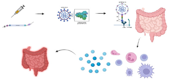 Pathogenetic hypothesis related to COVID-19 post-vaccine adenomesenteritis: The administration of the m-RNA vaccine results in spike protein expression. Spike protein receptors are numerous at the level of enterocytes. The vaccination could act as a trigger and cause an immune-mediated inflammatory response in the gastrointestinal tract resulting in the adenomesenteritis. The figure was created in BioRender.com (accessed on 17 June 2022).