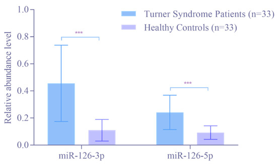 Abundance level of miR-126-3p and miR-126-5p in Turner Syndrome patients compared to healthy volunteers as determined by RT-qPCR. The mean relative abundance level (2−ΔCt) of all Turner Syndrome patients and healthy volunteers. RNAU6B was used as an endogenous control for the normalization of miRNA. Unpaired Student’s t-test and mean ± standard deviation were used to evaluate differences in abundance levels. *** p ≤ 0.001.