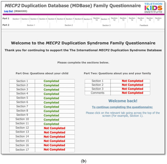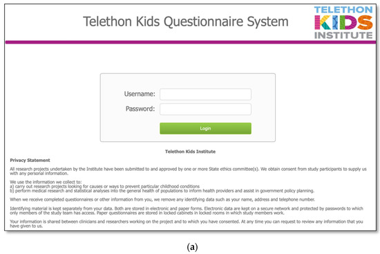The MDBase infrastructure was created using FileMaker Pro, a database application, with access to the questionnaire for families provided through FileMaker WebDirect (Figure 1a). The entire family questionnaire was piloted by seven parents and seven researchers on a variety of devices including computers, tablets (iPad) and phones (Apple and Android), and web browsers (Safari, Chrome and Internet Explorer) to ensure optimal user experience. The questionnaire was designed so that families could enter their data, save their progress and return at a later time (Figure 1b). The database is hosted on a secure webserver located at the Telethon Kids Institute, Western Australia. Data are exported from the webserver to an internal password-protected FileMaker Pro database. Data are cleaned within the FileMaker Pro database, deidentified and exported to a Stata statistical software data file for analysis.
