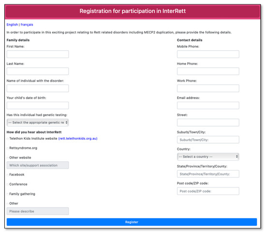 Upon registration, families were contacted by phone or email (email only if no phone number was provided) and invited to participate in the MDBase and the family questionnaire. Previously ascertained families from InterRett were also contacted and invited to participate in the new database. Families of individuals with MDS who had died were also provided with the opportunity to contribute data. Families who agreed to partake in the study were emailed an information sheet and a set of secure, unique login credentials for each individual in the family of the person with MDS. Upon login, families were presented with a consent form before proceeding with their responses.