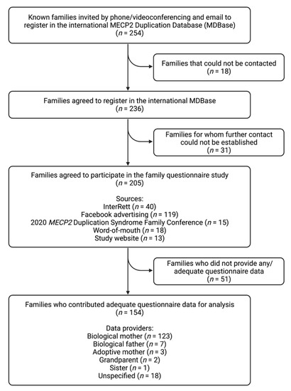From 13 April 2020 to 13 March 2022, attempts were made to contact the families of 254 individuals with an MECP2 duplication known from prior sources (i.e., InterRett) and new sources (i.e., our registration webpage) via a combination of phone (n = 248) and email (n = 6; Figure 4). Initial successful contact was made with the families of 236 individuals of whom 205 (87%) agreed to participate in the questionnaire study. Aside from InterRett (n = 40), sources of ascertainment documented on the registration page were Facebook advertising (n = 119), the 2020 MECP2 Duplication Syndrome Family Conference (n = 15), sharing of our study on MDS-related advocacy websites, by word-of-mouth (n = 18), and our study website (n = 13).