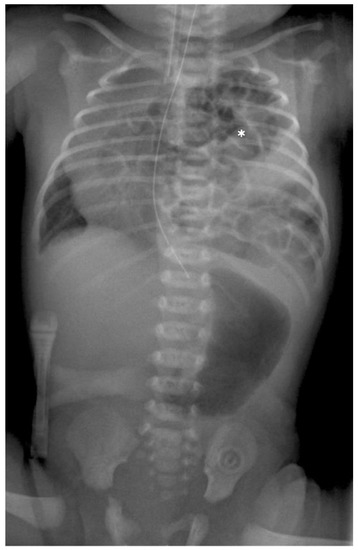 Preoperative radiograph of a left-sided CDH. The * indicates the intrathoracic bowel.