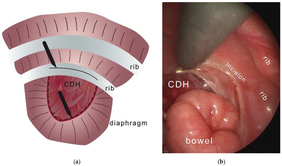 - Costerus, S.; Zahn, K.; van de Ven, K.; Vlot, J.; Wessel, L.; Wijnen, R. Thoracoscopic versus Open Repair of CDH in Cardiovascular Stable Neonates. Surg. Endosc. 2016, 30, 2818–2824. [Google Scholar] [CrossRef] [PubMed]