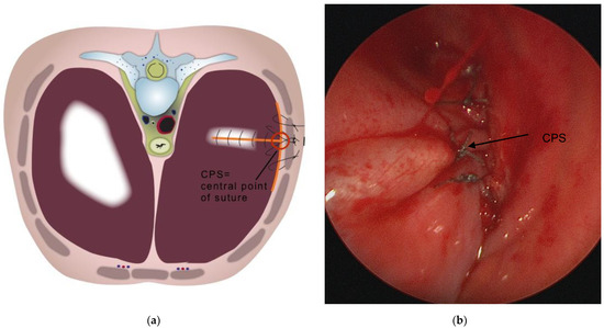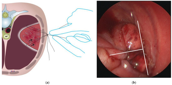 Intraoperative situation: Once the defect is visible thoracoscopically, the center of the opposing diaphragmatic margins is taken by two graspers and pulled in a T-shape toward the thoracic wall. This is to verify the tension and the possibility of closing the gap using primary sutures. The margin of the pleuro-peritoneal canal is incised circumferentially to create an iatrogenic wound to the adjacent surfaces. This is considered beneficial for subsequent scarring and to improve the strength of the compound (see Figure 2a,b). Outside the thorax, at the expected central point of suture (CPS) we set an incision of 3 mm into the skin. At each center of the opposing diaphragmatic edges 3.0 Ethibond threads (Ethicon, Inc., Route 22 West, Post Office Box 151, Somerville, NJ 08876, USA) are placed (see Figure 3a,b). The sutures are laid, one superior, one inferior, around the rib (see Figure 4). The needles of the corresponding sutures are pierced from intrathoracic towards extrathoracic. The subcostal needle must be guided in contact with the bone’s circumference in order to avoid potential injury to the subcostal nerve and vessels. Now, the threads pass the thoracic wall and the skin incision. The knots are pulled down slowly by hand from the outside to control the traction (see Figure 3a). The camera observes the approximating edges until the gap is closed. This maneuver is the core element for the successful closure of the gap only using sutures. To complete the fixation of the defect and as a reinforcement, up to seven additional sutures are positioned in the same pericostal way. It may also be necessary to include adjacent ribs through pericostal sutures. Further, single sutures are placed to close the remaining muscular defect. Finally, the edges move towards each other in a T-shaped figure (see Figure 5a,b). Subcutaneous sutures are not necessary. All skin incisions are sealed by glue. A pleural drainage Ch 18 without suction is placed through the ventral access of the trocar.