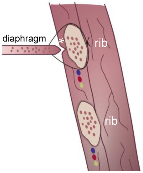 The seam runs around the rib, preferably located between the rib and the subcostal vessels. Further along are the cut (*) in the pleuroperitoneal channel and the ideal insertion of the diaphragm at the rib.
