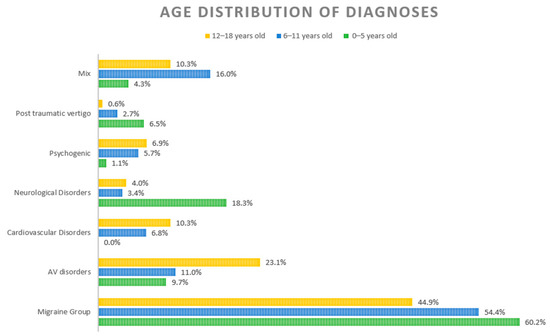 The prevalence of balance disorders in children and adolescents is extremely variable. Figures between 0.4% and 15% have been reported [1]. Fancello and coworkers [1] reviewed the literature of the last decade about the prevalence and the different etiologies with regards to age groups. They performed a selection using PRISMA guidelines and included 7 papers in their analysis. The total number of patients in the studies was 2470, there were subjects with multiple diagnosis with a total number of 3399. The age of the patients varied from 9 months to 21 years old, while a male to female ratio of 1:1.3. Vestibular migraine and other migraine variants represented the most frequent diagnosis (32.7%), followed by audio-vestibular disorders (23.9%), psychogenic vertigo (11.3%), neurological diseases (10.4%), post-traumatic vertigo (8.8%), motion sickness (3.6%), cardiovascular diseases (2.1%), and ophthalmic disorders (1.5%). Sporadic causes included dental, metabolic disorders and other systemic diseases representing 4.7% of diagnoses. The etiology was unknown in 0.9% of patients. The diagnoses in three age groups vase reported by 3 among the 7 papers: preschool (0–5 years old), elementary school (6–11 years old) and adolescents (12–18 years old). The results of the different age groups are reported in Figure 1. The migraine group contains patients from all the age groups (Figure 1). In the audio-vestibular group, benign paroxysmal positional vertigo accounted for 49% of disorders. Neurological disorders were particularly frequent in preschool children (Figure 1). Among neurological disorders, dysautonomia represented 46% of diagnoses.
