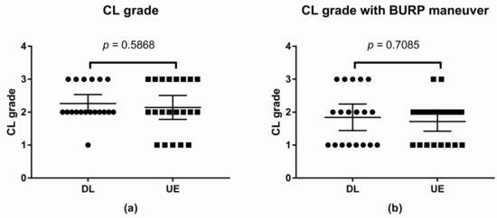 Scatter plot of Cormack and Lehane Laryngeal View grade (a) CL grade (b) CL grade with the BURP maneuver. Abbreviations: DL, direct laryngoscope group; UE, UEscope group; CL, Cormack and Lehane Laryngeal View; BURP, backward, upward, rightward, and posterior pressure.