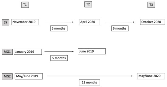 Data collection started when children were attending grade II of a primary school in Florence, Italy. The class involved in the study was selected thanks to a collaborative relationship between the researchers and the class teacher. They were followed longitudinally for five months between the first (T1, November 2019) and the second assessment (T2, first lockdown in April 2020) and for the subsequent six months between the second (T2, April 2020) and the third assessment (T3, October 2020) when the children had moved to grade III. Moreover, data from two groups of children (matched group 1 [MG1] and matched group 2 [MG2]) were used as a control condition to compare the EG changes in narratives during pandemic to the MG changes in narratives during a non-emergency situation. The two groups were selected from a larger sample who performed the narrative test before the pandemic emergency according to a longitudinal design at five (MG1) and twelve months (MG2) intervals (see Figure 1). Children in the two groups were selected retrospectively on the basis of the class attended and narrative skills in order to make both groups comparable to the study sample group. Specifically, children in MG1 (14 F, 6 M; mean age 7.24) were assessed in grade II of primary school in January 2019 (T1) and then, in June 2019 (T2), five months apart. Children in MG2 (7 M, 14 F; mean age 7.04) were assessed in grade II of primary school in May/June and then, approximately one year later, at the end of grade III of primary school (May/June).