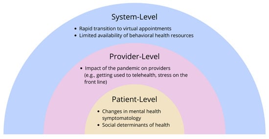 We identified five main themes derived from the data: (1) rapid transition to virtual appointments, (2) limited availability of behavioral health resources, (3) impact of the pandemic on providers, (4) changes in mental health symptomatology, and (5) social determinants of health (See Table 2 for additional quotes). Applying a social-ecological framework, we organized themes into three domains: system-, provider-, and patient-level (Figure 1). In this context, the individual experiences of the patients and providers, as well as their interpersonal interactions, occur within the context of the mental health care system and society. These simultaneous, evolving interactions sum to influence a provider’s experience providing mental health care during the COVID-19 pandemic.