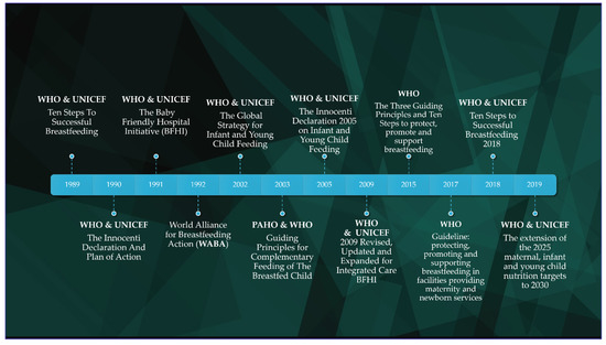 In 2009 the BFHI originators assembled again in the view of the necessity to integrate the new nutrition guidelines, as well as manage the HIV burden on mothers. Thousands of hospitals had been certified formerly throughout the world, but the unprincipled marketing of breast-milk substitutes still prevailed. The 2009 Revised, Updated and Expanded for Integrated Care BFHI package consisted of five sections, methodically structured, and included comprehensive information and guidance to hospitals, facilities, administrators and policymakers, along with a 20-h course for maternity staff [36]. In March 2015 the BFHI was expanded to neonatal wards, addressing the challenges of prematurity and hospitalization. Based on the earliest research findings about the vital role of breastfeeding in reducing neonatal mortality, the Three Guiding Principles and Ten Steps to protect, promote and support breastfeeding redefined the goals [37]. 30 years after the first attempt to establish the “breastfeeding culture”, the BFHI received a revision that focused on enhancing the appeal of the initiative and on ensuring that all maternity facilities adopt the policy. Based on the previously developed Guideline for protecting, promoting and supporting breastfeeding in facilities providing maternity and newborn services by WHO [38], 2017, the revised Ten Steps to Successful Breastfeeding 2018, reviewed in an extensive way in the relative document, applied to almost all maternal and neonatal services [39]. The 5th target refers to the exclusive breastfeeding rates and an increase to 50% by 2025 was demanded. An update to the scope of work evolved recently, redefining the target by an increase to 70% by 2030. The extension and revision of all of the aforementioned nutrition targets was reported in the relevant WHO/UNICEF discussion paper that was published in June 2019 [40]. A comprehensive timeline of the international strategies that promote breastfeeding and optimal eating habits for children is shown in Figure 1.