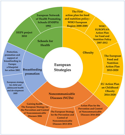 International nutrition policies tried to highlight the significance of an integrated approach in the promotion of children’s healthy nutrition; similar actions and policy frameworks have appeared over time in the European region as well. David Byrne, the European Commissioner for Health and Consumer Protection, at the EU Conference on Promotion of Breastfeeding in Europe on the 18th of June 2004, presented the Protection, promotion and support of breastfeeding in Europe: a blueprint for action. That was the first European action plan in the field of breastfeeding promotion and support, which had been developed two years earlier [74]. In accordance with the MDGs, the WHO regional office for Europe in 2005, developed the European strategy for child and adolescent health and development, stating the importance of the early years of life in establishing optimal nutrition practices [75]. The rising rates of childhood obesity in the following years led to the launch of the EU Action Plan on Childhood Obesity 2014–2020 in 2014, which aimed to suspend the accelerating increase of the problem among children and young people aged 0–18 years [76]. A parallel strategy was developed one year later by WHO, the European Food and Nutrition Action Plan 2015–2020, aiming to combat the preventable diet-related NCDs, obesity, and all other forms of malnutrition [77]. There had been two previous similar documents, The First action plan for food and nutrition policy: WHO European Region 2000–2005 and the WHO EUROPEAN Action Plan for Food and Nutrition Policy 2007–2012 that had tried to provide an initial framework for children’s nutrition [78,79].