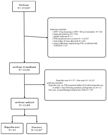 In total, 151,015 neonates were born at Chang Gung Memorial Hospital (based on birth record files) during the period from January 2004 to July 2020. Of those, 382 had missing data or a BW < 400 g, 1784 were duplicates (mainly caused by having no ID at birth), five were of unknown gender, 102,473 only had their TSB monitored once, 444 died within 30 days after birth, 31,464 did not undergo phototherapy (no TSB monitoring), and 147 were infected with cytomegalovirus, herpes simplex, syphilis, or varicella zoster, were administered ceftriaxone, or experienced intraventricular hemorrhage. The aforementioned neonates were excluded, and hence a total of 14,316 neonates were identified. Among these 14,316 neonates, 97 were administered ibuprofen, while 14,219 were not. Furthermore, 33 neonates given ibuprofen were excluded owing to not having had their TSB level monitored within 48 h before or 7 days after initiation of ibuprofen use, and 792 not given ibuprofen were excluded due to not having phototherapy between two monitored TSB levels. Therefore, in total, 13,491 neonates were entered into this study, 64 who were administered ibuprofen and 13,427 who were not (Figure 1).