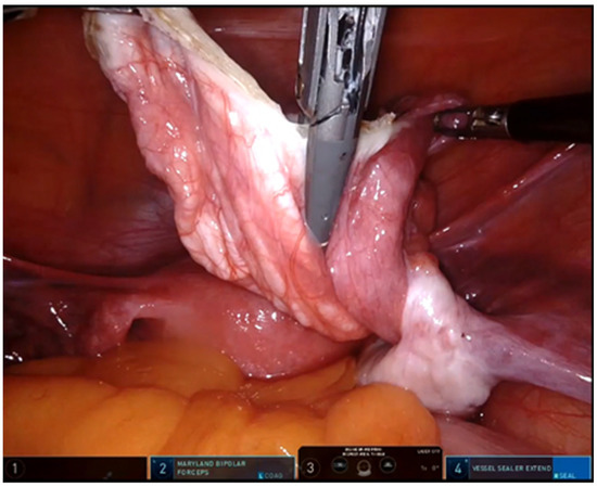 Figure 2. Use of sealing device in robotic removal of ovarian mass.