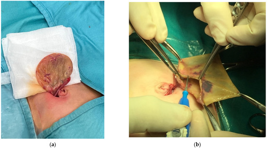 In the case of neonatal cysts, an ovarian sparing procedure is always indicated, as described in the literature [8,10,11]. In our series, in most cases it was possible to remove the mass and spare the ovary, with excellent long-term results. The procedure involves the removal of the ovary through the navel (Figure 4) and, only if healthy tissue is not available, an ovariectomy is indicated [12].