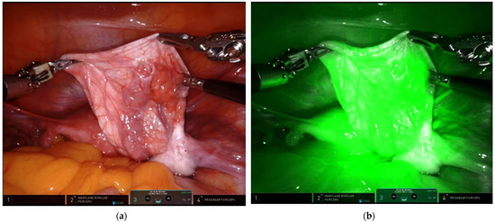 Figure 5. The role of ICG system to check the vascularization of the ovary after detorsion: (a) without ICG; (b) with ICG view.