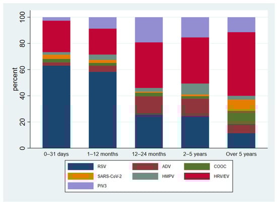 Overall, most panels (947/1763, 53.8%) were performed in children aged 1–12 months. The distribution of specific pathogens according to patients’ age is reported in Figure 1. No significant seasonal difference was observed in the proportion of positive panels over the total performed. Nevertheless, in Autumn, the number of processed panels (n = 1124) was significantly higher than Winter (n = 332) and Summer (n = 307).
