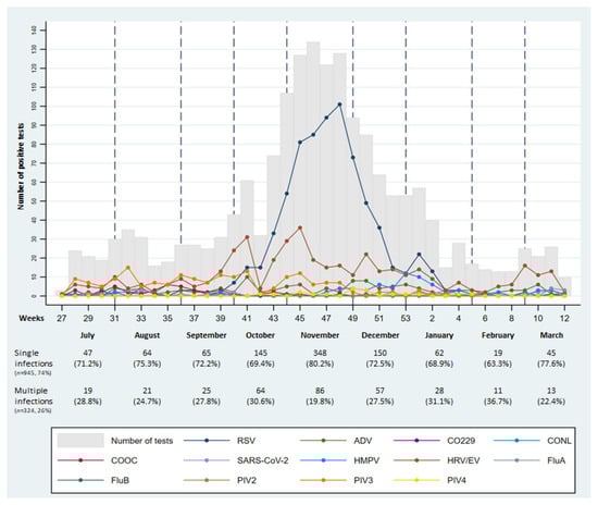Compared to the available literature, our research has several strengths. First, all analyzed patients had received a diagnosis of ARI of documented etiology. Secondly, we provided a complete analysis not limited to RSV, but also including a wide range of detectable respiratory pathogens. Finally, the study period was prolonged to March 2022, thus covering all the months usually involved by a significant spread of respiratory infections. This longer study period confirmed the progressive disappearance of RSV during January and February 2022, i.e., the months usually characterized by its peak in the pre-COVID-19 seasons. On the other hand, the retrospective design, and the lack of correlation between detected pathogens and clinical severity are among the main drawbacks of our study. Moreover, as we analyzed data up to the 12th week of 2022, we cannot exclude further changes in the proportions of circulating respiratory viruses in the following months. Finally, only data of RSV admission during the pre-pandemic period were available for analysis in our study; therefore, we could not compare the 2021–2022 season with pre-pandemic data for viruses other than RSV.