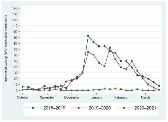 - Agha, R.; Avner, J.R. Delayed Seasonal RSV Surge Observed during the COVID-19 Pandemic. Pediatrics 2021, 148, e2021052089. [Google Scholar] [CrossRef] [PubMed]