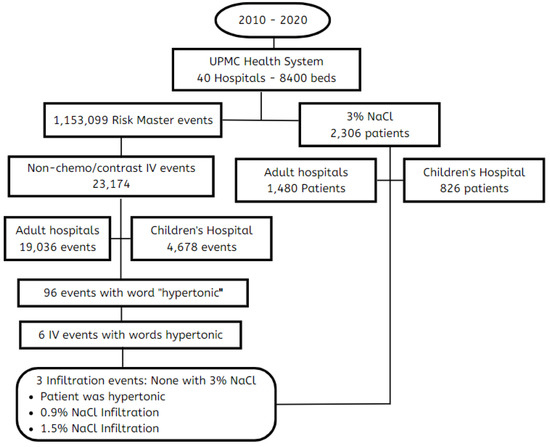 A query was conducted through the Risk Master database to determine if there were infiltrations or extravasations associated with hypertonic saline administration throughout the UPMC health system during a 10-year time period from 14 May 2010 to 14 May 2020 (Figure 1). The search was UPMC system-wide, including all acute care facilities, home care services, senior living facilities, rehab centers, cancer centers, personal care settings, physician offices, and ambulatory care centers. The UPMC health system consists of 40 hospitals with 8400 licensed beds. The query involved both adults and pediatrics.