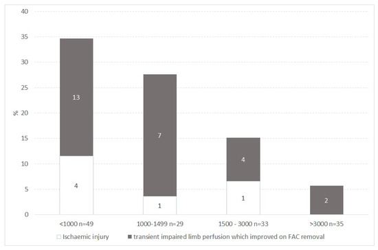 Proportion of FAC causing transient impaired limb perfusion which improved on FAC removal and ischaemic injury by weight category at time of insertion. n = the number of FAC inserted in each weight category.