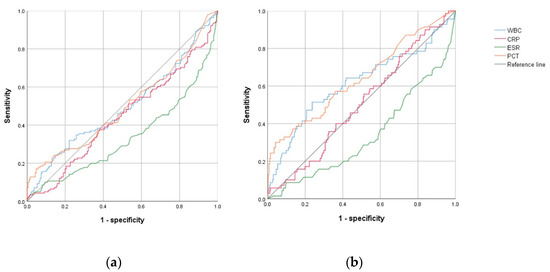The ROC curves were constructed by differentiating the BI and NBI groups. The areas under the curve (AUCs) were 0.495 for WBC, 0.443 for CRP, 0.335 for ESR, and 0.498 for PCT. All these markers were insignificant in distinguishing between the BI and NBI groups. (Table 3 and Figure 1A) However, when comparing AUCs between the IBI and other groups, PCT (0.640, 95% CI: 0.562–0.719, p < 0.001), WBC (0.615, 95% CI: 0.532–0.698, p = 0.003), and CRP (0.508, 95% 0.434–0.581, p = 0.843) were determined to be useful markers; however, CRP outcomes were not statistically significant. The optimal cut-off values were 15,860 × 106/L for WBC (sensitivity: 46.8%, specificity: 76.3%) and 1.8 ng/mL for PCT (sensitivity: 39.4%, specificity: 87.1%). However, PCT and WBC yielded poor accuracy (Table 3 and Figure 1B).