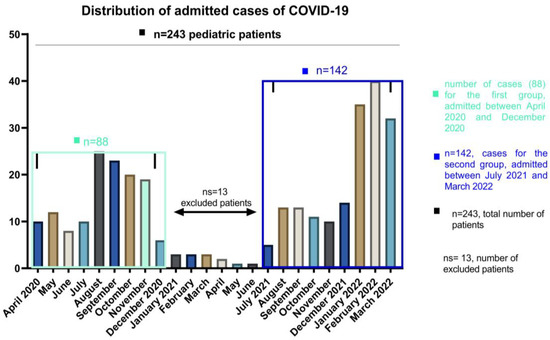 Patients aged less than 18 years on the date of hospital admission were enrolled on the study group. The patients were divided into 3 different age groups, 0–4 for infants and toddlers, 5–12 for children and 13–18 years old for teens and older. We included the patients according to the distribution of the waves of COVID-19 among pediatric patients in our country, and the exclusion criteria were related to the number and the impossibility of comparing such a small number with the other waves of patients admitted in the periods April–December 2020 and July 2021–March 2022. The 13 patients were therefore excluded based on their number and not on symptomatology, which is similar to the other age and gender categories. Details of demographic data are presented in Table 1. For this report, we included a total of 230 patients who resemble the peak distribution waves at admission as follows: the first group of 88 patients, which corresponds to the year 2020 (between April and December 2020), and the second group of 142 patients which were admitted between July 2021 and March 2022. (See Figure 1). Among 243 pediatric patients, 13 of them who were hospitalized between January and June 2021 were not included in the research group as we used to compare the larger groups of the pandemic waves. When values were regularly distributed, we presented continuous variables as mean (SD: standard deviation) and median (IQR: interquartile range) otherwise. Categorical variables were presented as frequencies and percentages. When comparing groups, categorical data were using and we show results using Chi-square or Fisher’s test, while for continuous data we used Mann–Whitney test and two-way ANOVA to explore the main factors influencing comorbidities. Significant statistical differences resulted in p < 0.05. Statistical analyses were performed using GraphPad Prism 9.4.0 (GraphPad, CA, USA).