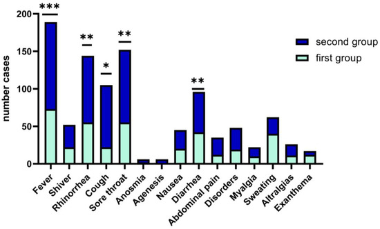 Clinical symptoms in both study groups associated fever (>38.5 °C), with cough and sore throat more frequently observed in the second group, 68% vs. 62%, p = 0.05), while for the first group of children, fever was present with the digestive tract clinical manifestations, and 47.73% associated diarrhea. (See Figure 3). Other less frequent clinical features are respiratory symptoms associated with gastrointestinal symptoms, as we found in both arms, without statistical significance (18.3% vs. 17.9%); see Figure 3.