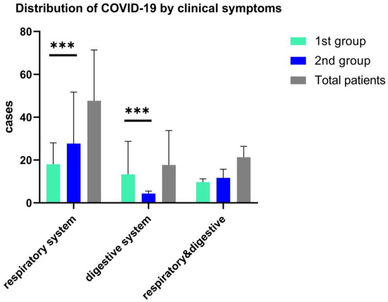 Distribution of COVID-19 in children by the onset clinical features, ***—p ≤ 0.001. Data are represented as mean with SD and shows the differences of respiratory and digestive symptoms and both clinical manifestations in a two-way ANOVA statistical analysis.
