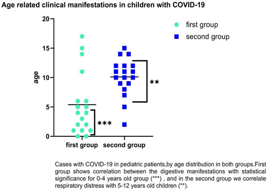 We followed the groups by age-related category, and it was observed that SARS-CoV-2 infection in children of first group predominates in the age groups of 0–4 years old with gastrointestinal symptoms such as diarrhea, abdominal pain, or vomiting (38.64% vs. 26.76%). For the second group, in the category of 5–12 years, we found (38.64% vs. 52.11%) with respiratory distress. There were significant differences for 0–1 years old, which encountered 42.86% diarrhea (p = 0.0001), and 5–12-years-old (p = 0.02) for respiratory distress as the main clinical symptoms (83.78%); (See Figure 4).
