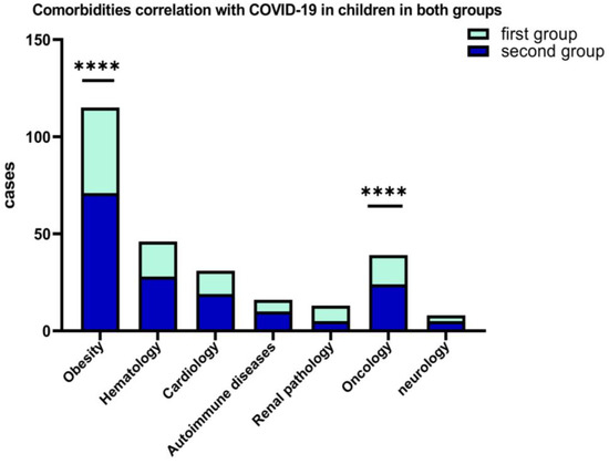 Results of 2-way ANOVA to compare the main effects of the associated COVID-19 comorbidities (obesity and oncological diseases, ****) in children in both groups.
