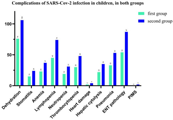 In our study, we found that complications associated with SARS-CoV-2 infection in children were represented by 79.13% (both groups) with dehydration, (75 vs. 106 patients), followed by 61.3% ENT pathology, such as pharyngitis, laryngitis, otitis, (54 vs. 87 pediatric patients), and 51.74% for lymphopenia (45 vs. 74 patients). Hepatic cytolysis syndrome has shown in 24.8% cases in total and 22 vs. 35 patients in each group of our study. The hematological picture shows anemia in 26%, neutropenia—21.74% and thrombocytopenia—34% for total patients. We also recorded a significant percentage of cases with acute interstitial pneumonia (37.4%), and 33 vs. 53 children. Cardiac impairment (myocarditis, pericarditis, heart rhythm disorders) was present in 2.4% of cases and 2 children have Pediatric Inflammatory Multisystem Syndrome (PIMS), with a favorable evolution under the established treatment (See Figure 6).