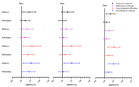 Using the psychological symptoms of children and adolescents in the high-grade PFI group as reference, binary logistic regression analysis was performed. Boys with a low-grade (OR = 1.485, 95% CI: 1.104–1.998) or middle-grade (OR = 1.375, 95% CI: 1.082–1.749) PFI had a higher risk of psychological symptoms, with statistical significance (p < 0.05). Psychological symptoms were risk factors for low grades of PFI in girls (OR = 1.467, 95% CI: 1.100–1.957) compared with high grades of PFI (p < 0.05). Overall, compared with the high-grade PFI, children and adolescents with a low-grade (OR = 1.476, 95% CI: 1.200–1.814) or medium-grade PFI (OR = 1.195, 95% CI: 1.010–1.413) were more likely to develop psychological symptoms (p < 0.05) (Table 3).
