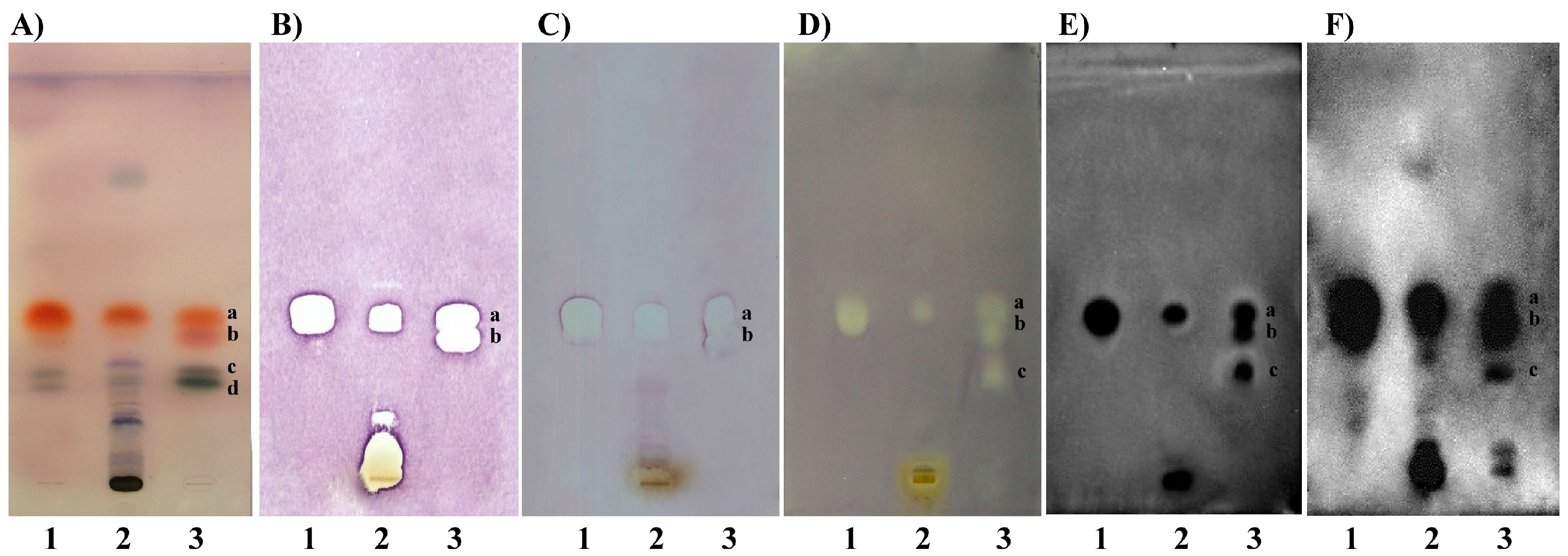 TLC Si60 F254 plates: (A) derivatization with anisaldehyde-sulphuric acid reagent; TLC-DB against: (B) Bacillus subtilis, (C) Escherichia coli, (D) Xanthomonas campestis pv. vesicatoria, (E) Pseudomonas syringae pv. maculicola, (F) Aliivibrio fischerii; tracks (1) thyme essential oil, (2) thyme 70% ethanol extract, (3) mixture of standards: a–thymol, b–carvacrol, c–linalool, d–borneol; mobile phase: chloroform.