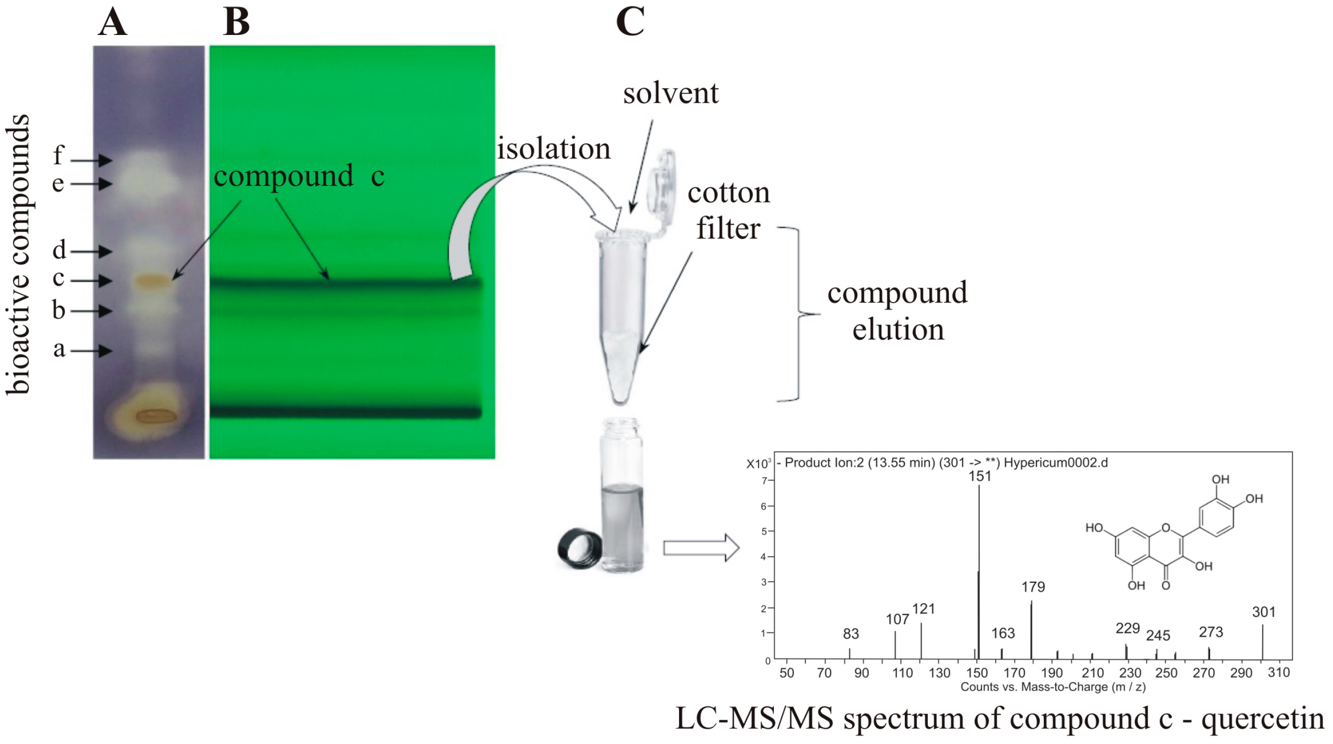 Preparative or semi-preparative TLC technique can be used to obtain larger amounts of the fraction/compound of interest. The sample is applied as a wide band and developed under selected chromatographic conditions. After solvent evaporation, bands of desired bioactive compounds are scraped off together with silica gel, and then they are eluted with appropriate solvent to vials. TLC semi-preparative fractionation of compounds showing antibacterial activity was successfully performed in our laboratory for many kinds of plant samples, such as Matricaria recutita (Asteraceae), Achillea millefolium (Asteraceae), Salvia officinalis (Lamiaceae), Thymus vulgaris (Lamiaceae) Chelidonium majus (Papaveraceae) and Hypericum perforatum (Hypericaceae) [54,55]. The bioactive fractions of Hypericum perforatum visible on schematic TLC-DB bioautogram (Figure 4) were isolated using semi-preparative TLC. Then they were concentrated and subjected to LC-MS analysis for structural evaluation. Five bioactive compounds were identified: 3,8'-biapigenin, quercetin, apigenin, kaempferol and linolenic acid [54].