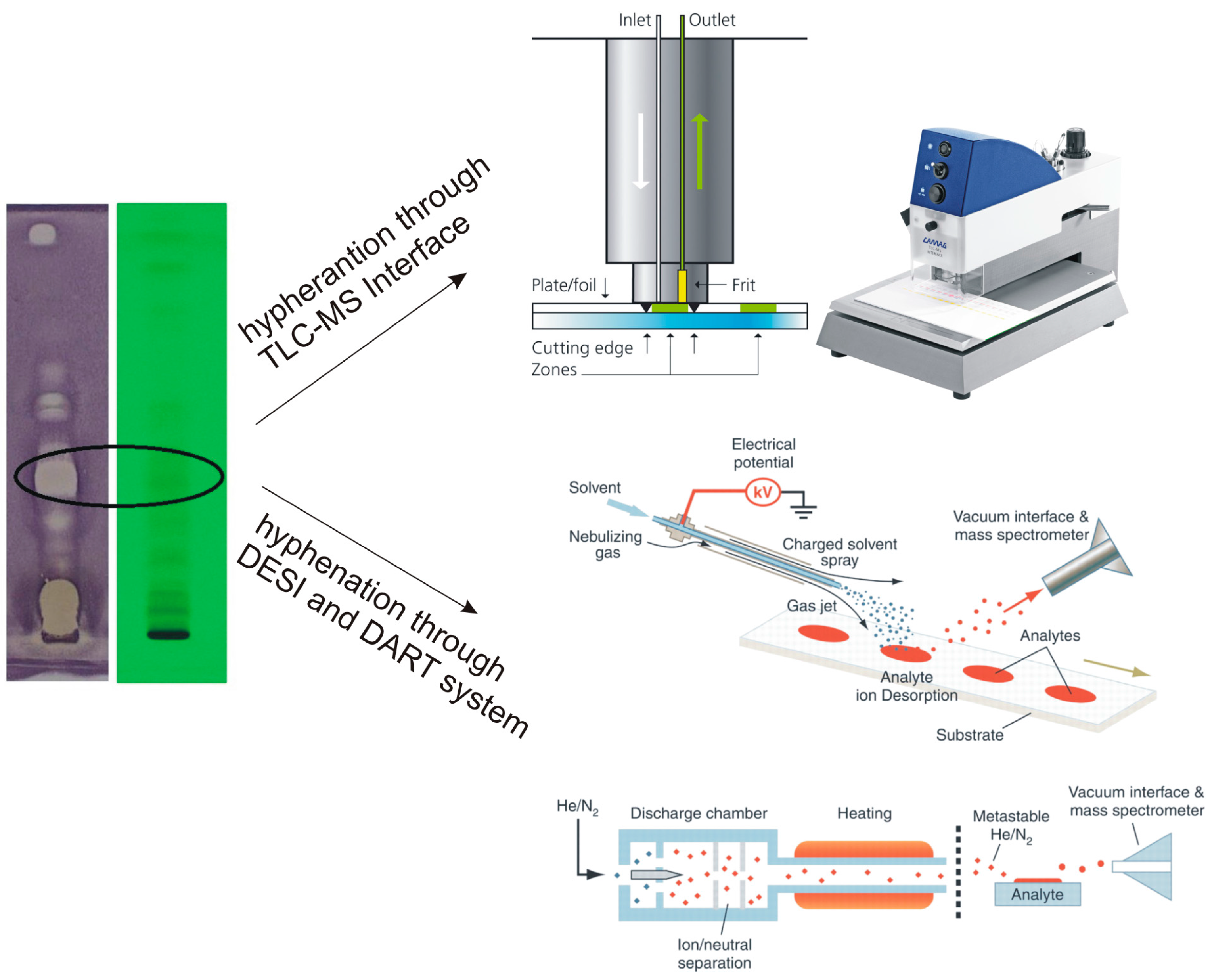 The scheme illustrating TLC-MS Interface, TLC-DESI/MS and TLC-DART/MS analyses. Reproduced with permission from Camag (TLC-Interface pictures) and from [61] (DESI and DART schemes).
