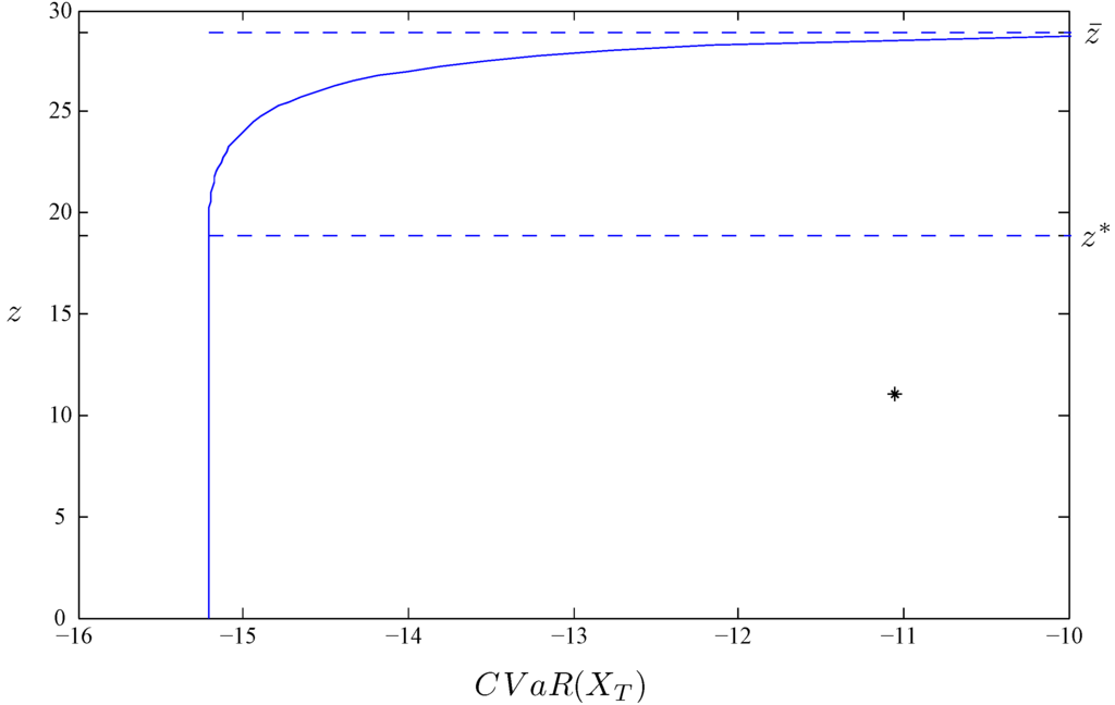 Figure 1 plots the efficient frontier of the above mean-CVaR portfolio selection problem with fixed upper bound . The curve between return level and are the mean-CVaR efficient portfolio from various three-line configurations, while the straight line is the same mean-CVaR efficient two-line configuration when the return constraint is non-binding. The star positioned at , where , corresponds to the portfolio that invests purely in the money market account. In contrast to its position on the traditional capital market Line (the efficient frontier for a mean-variance portfolio selection problem), the pure money market account portfolio is no longer efficient in the mean-CVaR portfolio selection problem.