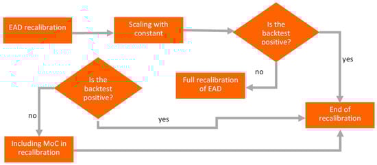 If the period cannot be qualified as downturn, a backtest approach with a scaling factor is applied and if it is positive (not rejected), it is the end of recalibration. If it is not positive (rejected), a full recalibration based on the Bayesian approach is applied. More sophisticated, hierarchical Bayesian models for LGD are applied instead of two combined models. The first model is used to separate all positive values from zeroes and the second model is than used to estimate only positive values (; ). If the backtest is not positive, the conservative MoC is needed. If the period is qualified as downturn, a backtest is applied on real data for LGD downturn. If it is positive, the recalibration ends. If the backtest is not positive (rejected), a conservatism option for LGD downturn is applied.