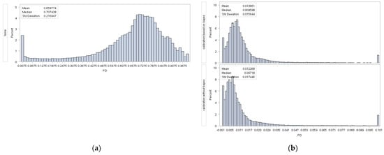 PD distribution: (a) Raw PD; (b) PD calibrated with and without the Bayesian approach. Source: own elaboration using SAS Enterprise Guide.